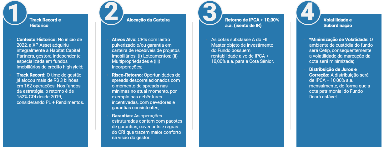 Fonte: XP Asset Management | https://www.infomoney.com.br/negocios/xp-asset-adquire-a-habitat-capital-partners-gestora-de-recursos-focada-em-fundos-imobiliarios/ Data de Acesso: 25/07/2025. Notas: (1) Na visão/opinião da Gestora. (2) Conforme Informado pela Gestora.
